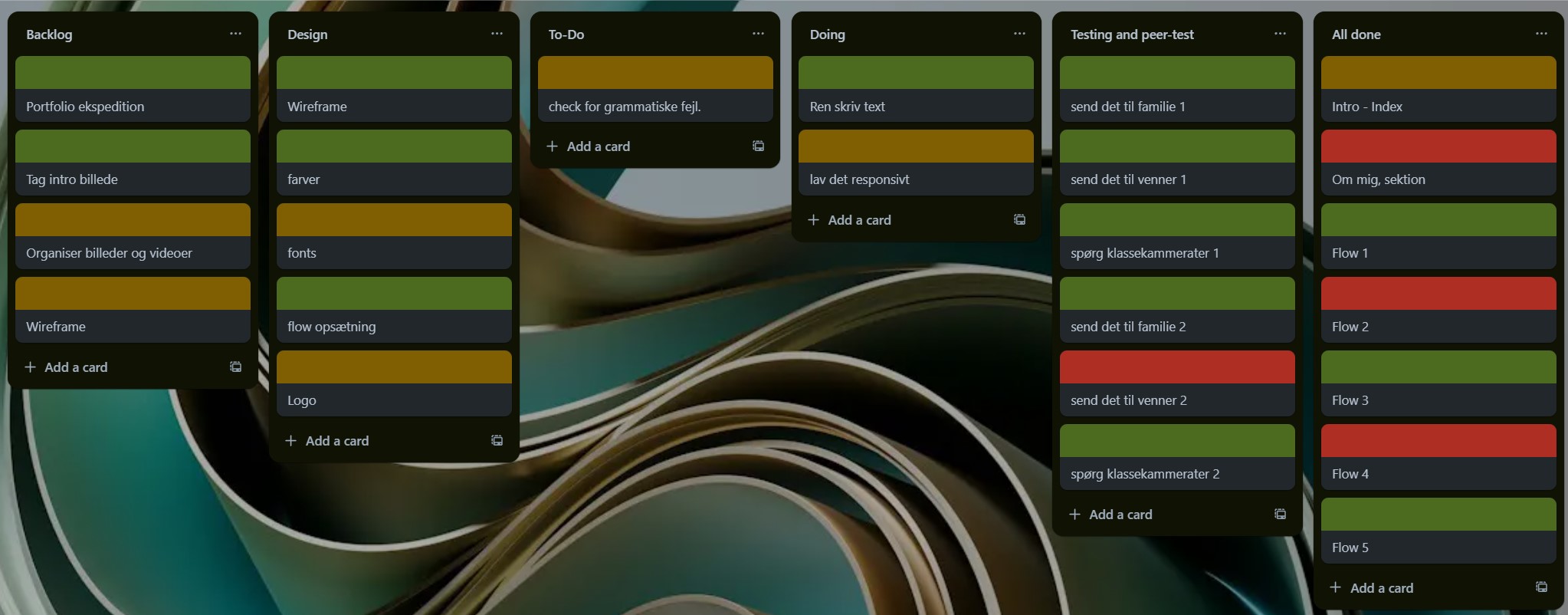 med min Trello, brugte jeg den lidt anderledes end jeg plejede, i stedet for at rykke rundt på de fanner jeg lavede, besluttede jeg mig for at farve kode dem, i følge